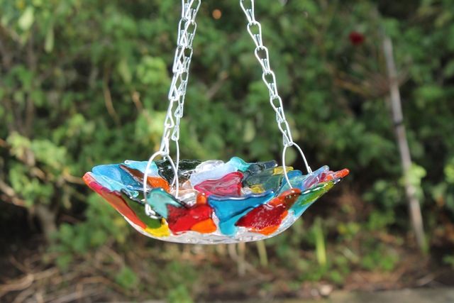 This meticulously crafted Small Bird Feeder with a vibrant surround features colourful glass leaves and is suspended by elegant chains, perfect for attracting feathered friends to your garden.