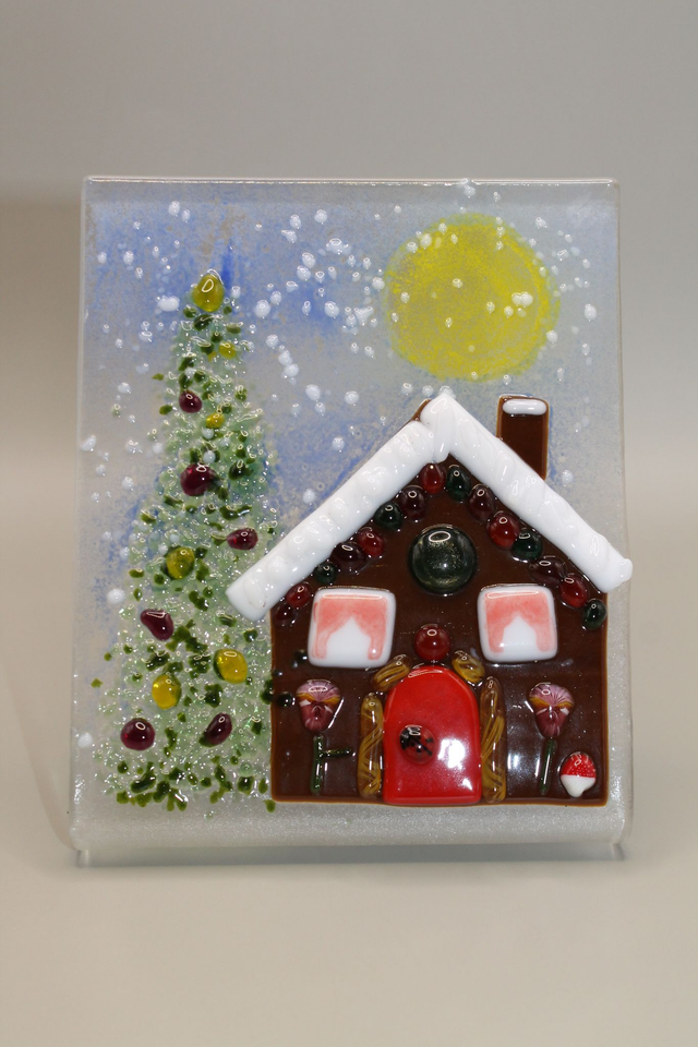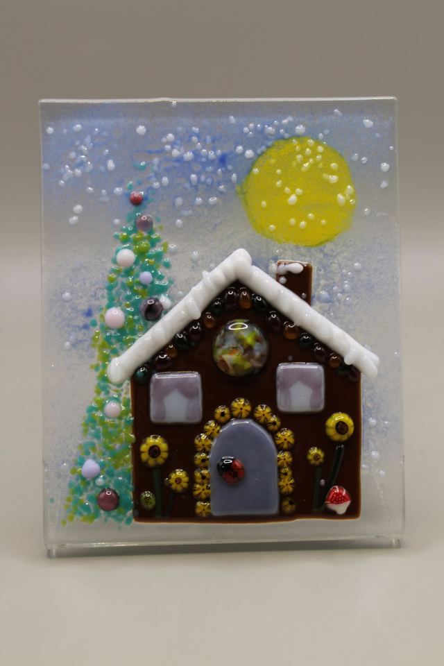Our Dark Gingerbread House Fused Glass Free-Standing Suncatcher captures the magic of Christmas in a stunning piece of art. This unique suncatcher features intricate details and vibrant colors that bring a festive Christmas scene to life. The free-standing design allows you to display it anywhere in your home, adding a touch of holiday cheer to any room. Handcrafted with care, this suncatcher is a perfect addition to your holiday decor or a thoughtful gift for a loved one. Brighten up your Christmas with this beautiful and versatile piece of fused glass art. The items stands aprox 6" tall by 4" wide.